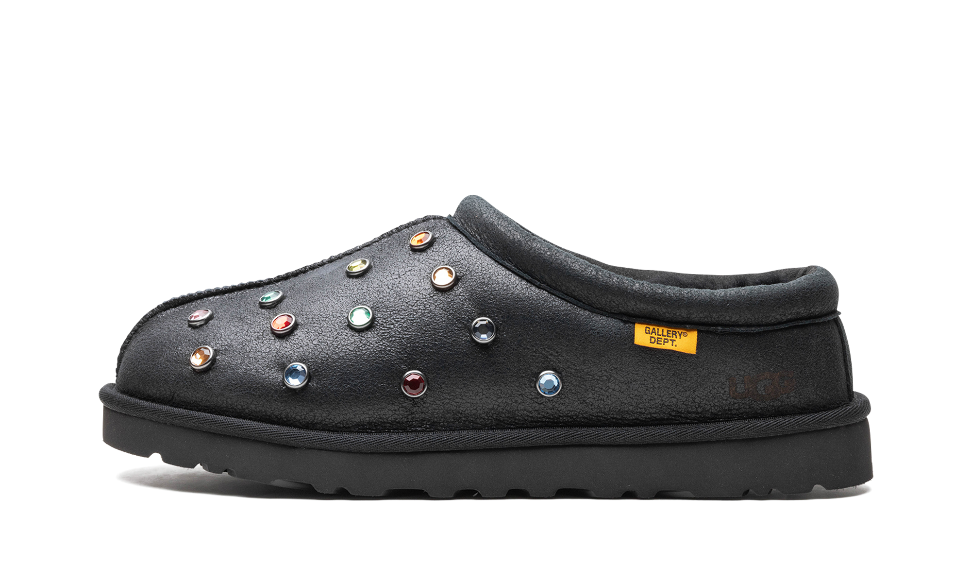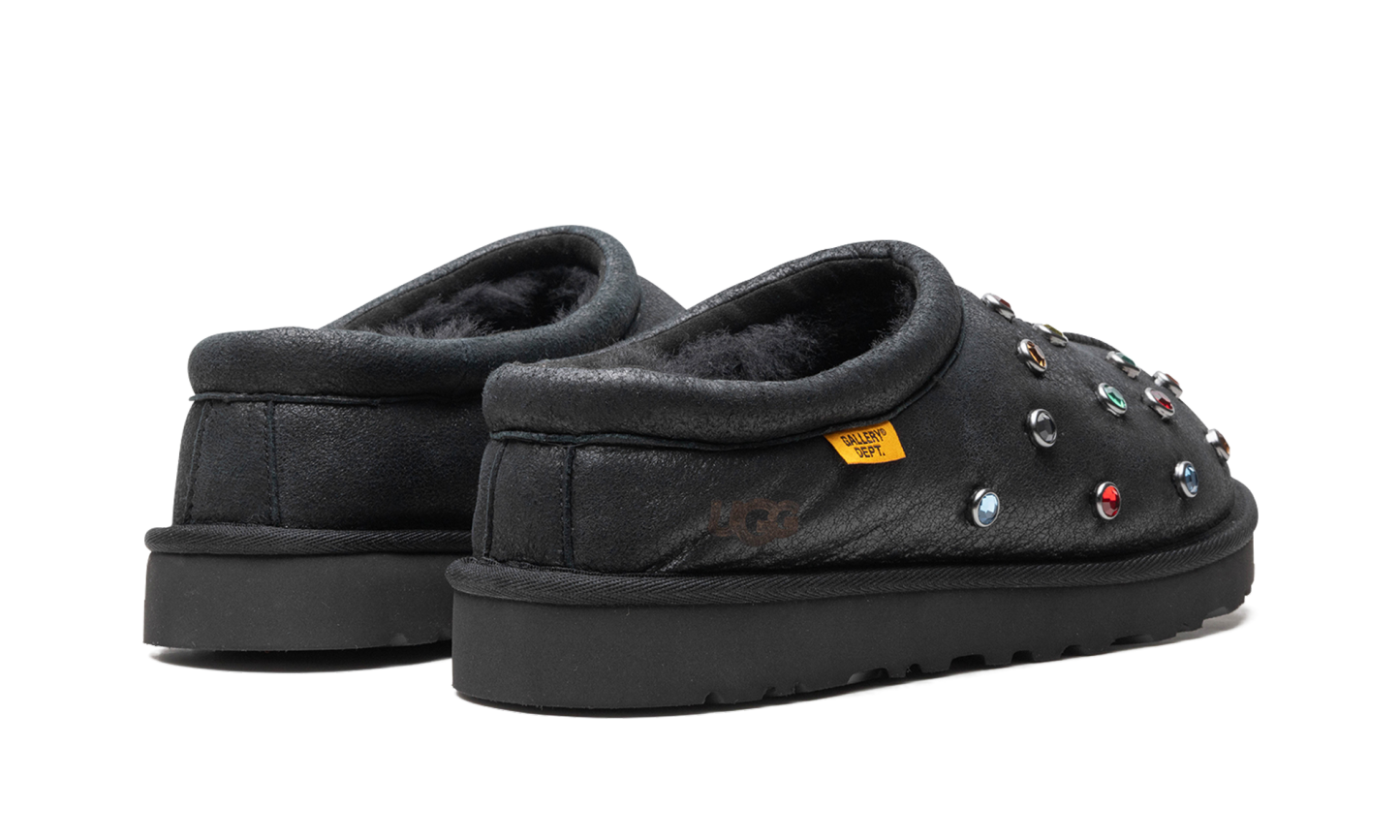 The Gallery Dept. x UGG Tasman Slipper “Black” is a collaboration by the Los Angeles based art and streetwear brand and UGG on the popular slip-on shoe. Gallery Dept.’s take on the UGG Tasman Slipper features an all-black leather upper embellished with multicolor metallic studs. The black inner lining is made with regenerative tablegrade and twinface sheepskin. A yellow “Gallery Dept.” hang tag appears on the lateral collar. Underfoot, a black rubber sole completes the look.