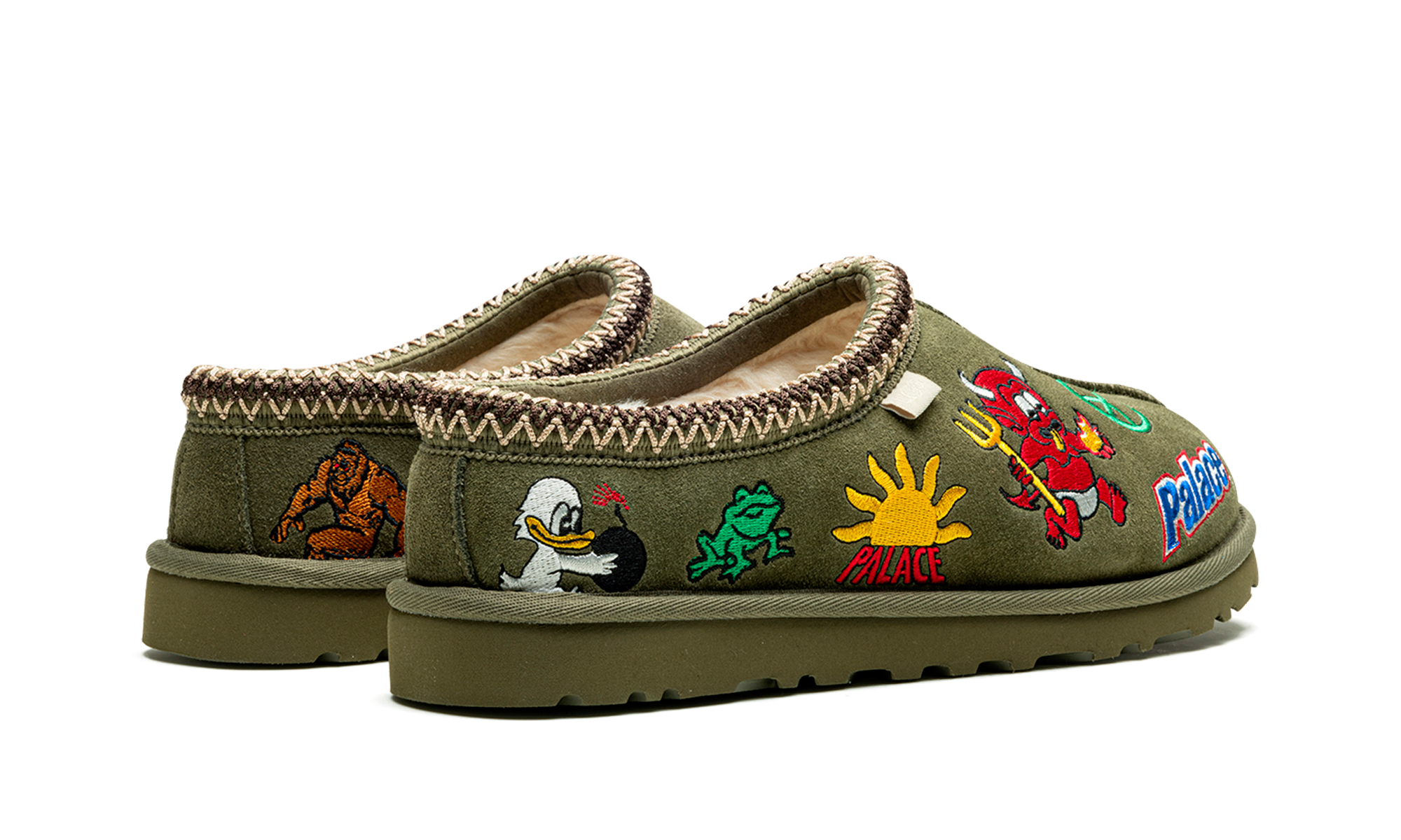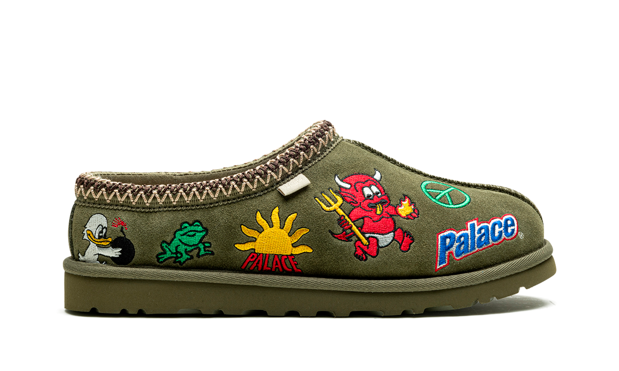 The Palace x Ugg Tasman “Burnt Olive” is a collaboration by the London skateboarding brand and the Australian footwear company on an earth tone colorway of the slip-on moccasin. From Palace’s Fall/Winter 2023 collection, the Ugg Tasman in “Burnt Olive” features embroidered patches in the form of a devil, frog, sun, peace sign, and “Palace” logo on the front, and a braid on the collar. The olive EVA foam sole has a traction pattern outsole to ensure grip on a variety of surfaces. Release date: December 1, 2023