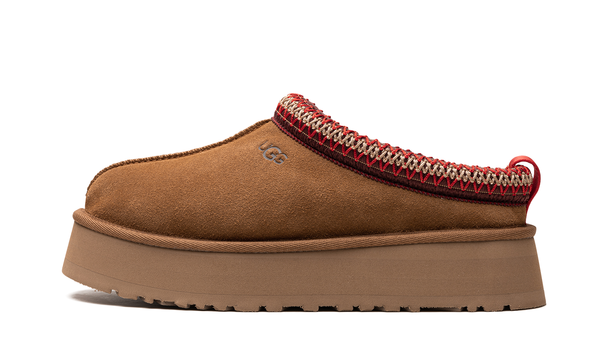 The Women’s Ugg Tazz “Chestnut” is the women’s sizing of the slip-on moccasin with a platform style sole in a brown colorway. Made for indoor or outdoor wear, the Ugg Tazz has a slipper-style design with a warm inner lining constructed of plush sheepskin and upcycled wool. The upper features a brown suede construction with an embroidered braid around the collar. Uggs branding is seen on the lateral side. The platform-style sole gives the wearer a significant boost in height, and is constructed in soft yet durable EVA foam for all-day comfort.