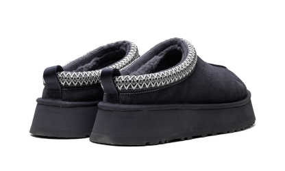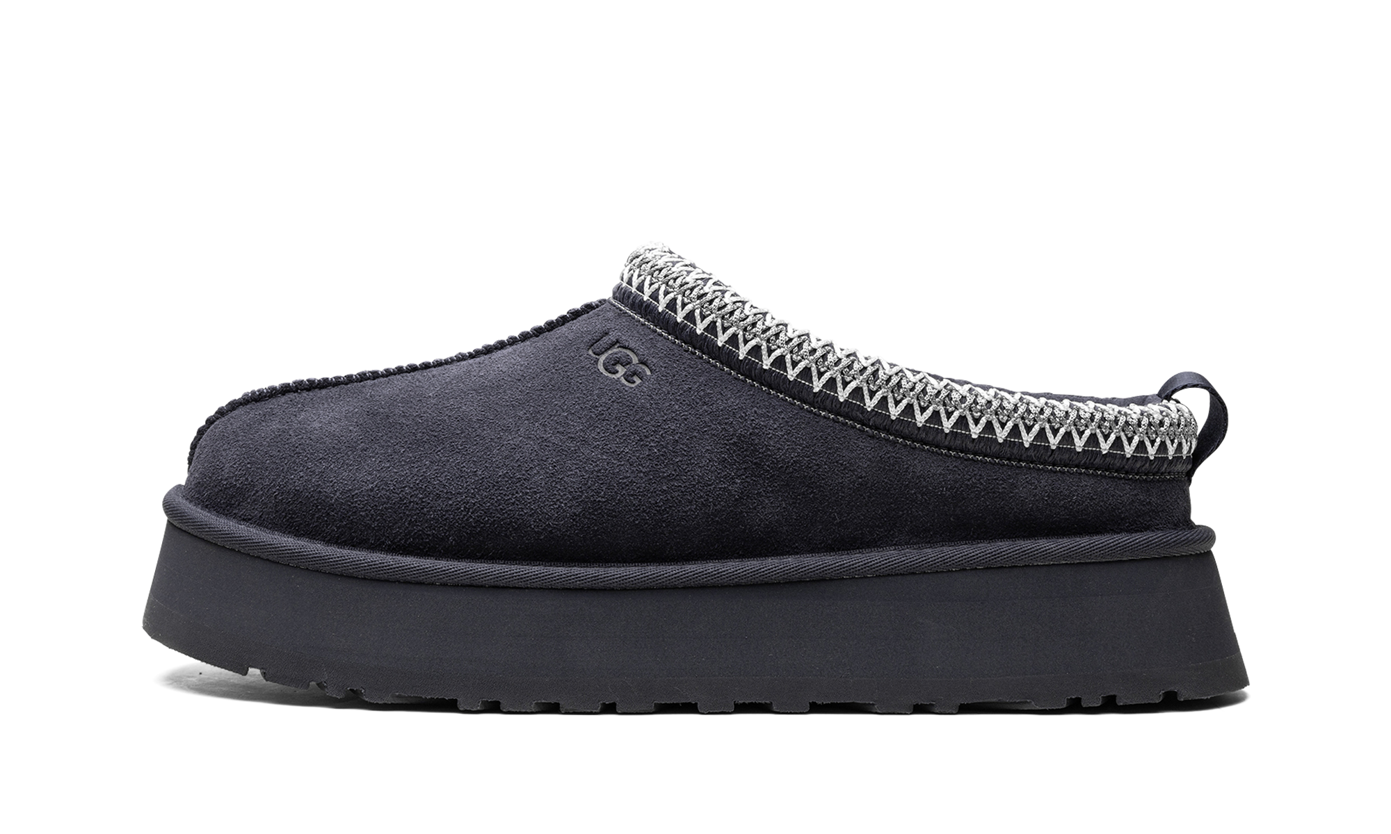 The Women’s Ugg Tazz “Eve Blue” is a dark navy colorway of the women’s sizing of the slip-on moccasin with a platform sole. The Ugg Tazz is made for indoor or outwear wear, and features a warm inner lining constructed of plush sheepskin and upcycled wool. Here, the upper has a Eve Blue (dark navy) suede construction with an embroidered braid around the collar. Uggs branding is seen on the lateral side. The platform-style sole gives the wearer a significant boost in height, and is constructed in soft yet durable EVA foam for all-day comfort.