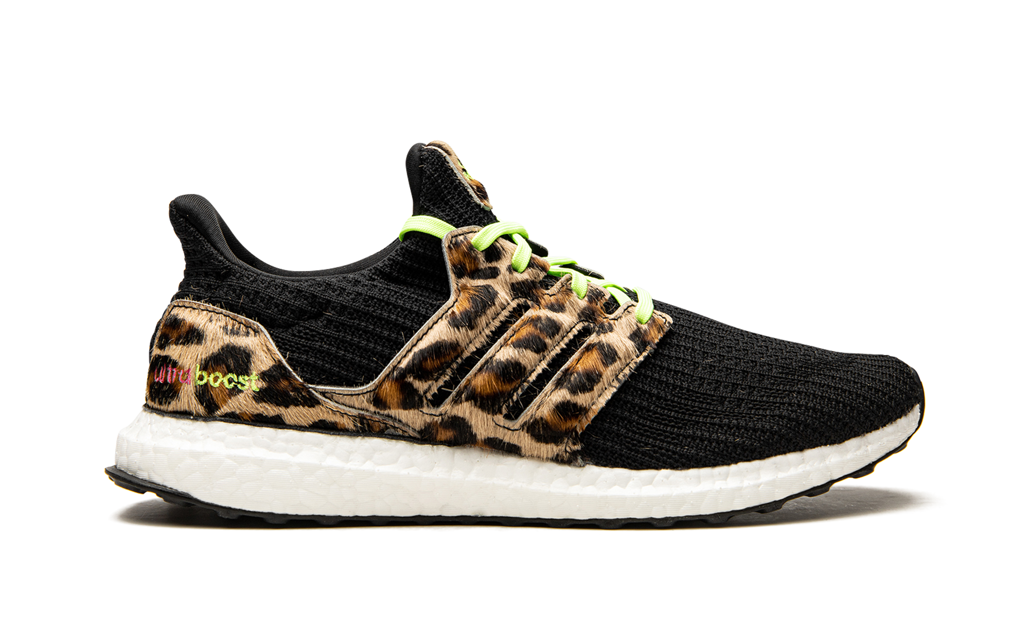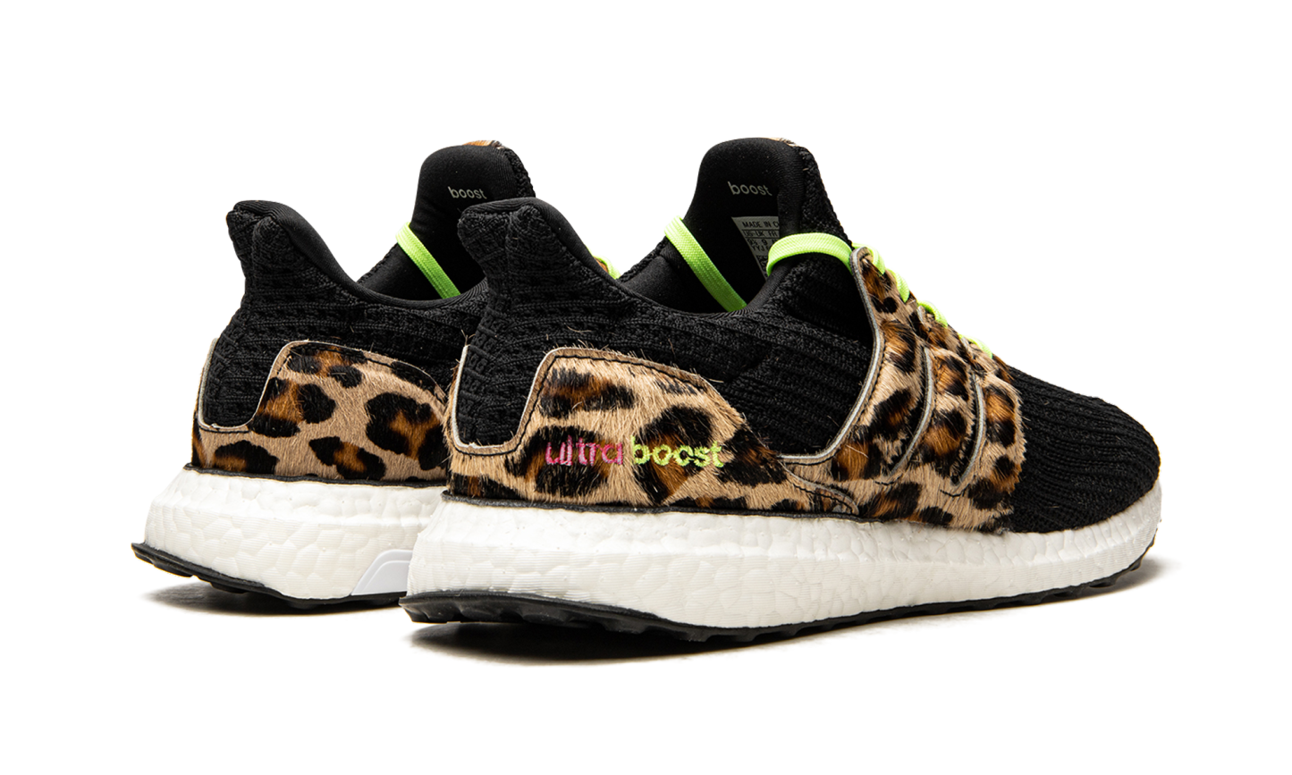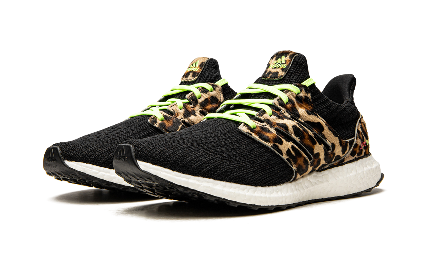 The adidas Ultra Boost “Animal Pack - Leopard” is a creative look for the performance running and lifestyle shoe by adidas that features exotic leopard print on its design. Released in December 2020, the “Leopard” Ultra Boost is one of the model’s more adventurous colorways as it combines a black woven Primeknit upper with faux leopard print on the Three Stripes lacing “cage,” molded heel cup, and tongue tag. Additional eye-catching details include neon green laces and “adidas” branding on the tongue, and pink and neon green “Ultra Boost” detailing on the lateral side of the heel counter. The shoe rides on a white Boost cushioned midsole protected by a Continental Rubber outsole. Release date: December 8, 2020