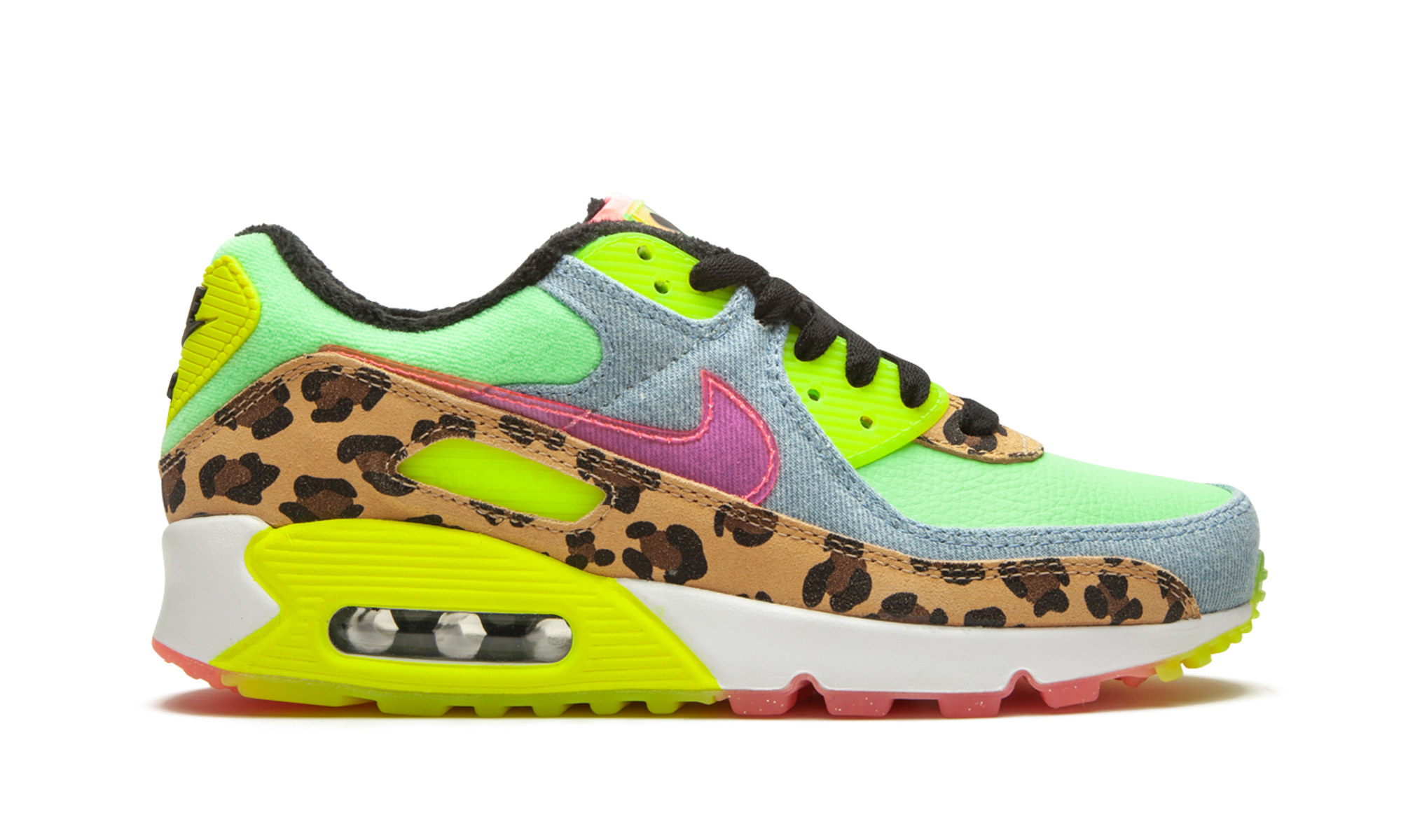 The Women’s Nike Air Max 90 LX “Denim Leopard Print” is a wild colorway of the retro performance running shoe that blends contrasting colors and materials to tell its story. Released by Nike to honor the Air Max 90’s 30-year anniversary, the “Denim Leopard Print” is certainly one of the more unique looks ever for the stately low-top shoe. Calling to mind ‘90s rave culture, a leopard pattern appears on the mudguard and lower eyelets. A washed light denim material can be found on the toe cap, mid-panel, and collar. Nike places a translucent pink Swoosh on the mid-panel for additional party-inspired flavoring. Other details include a Neon “Air Max” branding window and heel tab with black “Nike Air” detailing, a lime green leather base, and smiling floral character on the yellow translucent tongue tag. While the “Denim Leopard Print” is a progression in terms of its use of colors and materials, the model does retain its traditional clear Air unit in the heel. Denim Leopard Print