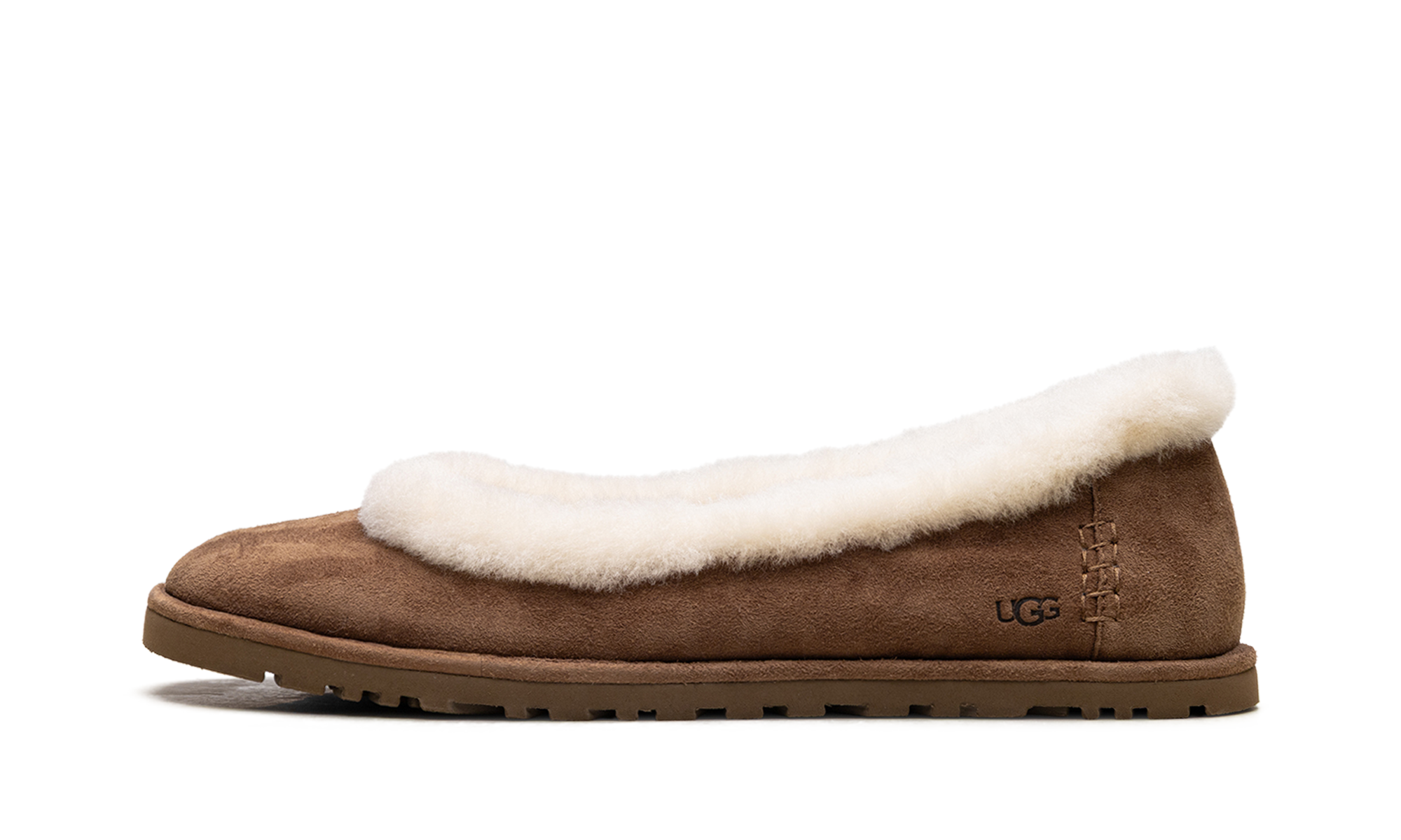 Step into cozy elegance with the UGG Zora Ballet Flat Wmns "Chestnut". This women's flat features a soft suede upper in a rich chestnut hue and a plush sheepskin lining for luxurious comfort. The versatile design delivers a comfortable fit and a refined look, perfect for making a sophisticated statement every day.